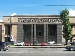 Главный фасад украшен портиком с пилонами, облицованными тёмно-серым гранитом из Жежелевских карьеров. Портик венчает аттик с горельефом из цемента с чугунными опилками (автор И. В. Крестовский)[3]. Согласно словам самого автора, все фигуры с фриза — реальные люди, хотя портретное сходство есть не всегда. Женщина-скульптор — Янсон-Манизер, живописец — Самохвалов, балерины — три Авроры из «Спящей красавицы» — Уланова, Вечеслова и Дудинская, «У рояля» — Преображенская, с фотоаппаратом — Стрекалов-Оболенский (которому единственному были приданы точные черты)[4].
