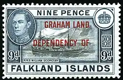 Почтовая марка Фолклендских островов, надпечатанная для использования на Земле Грейама (1944)