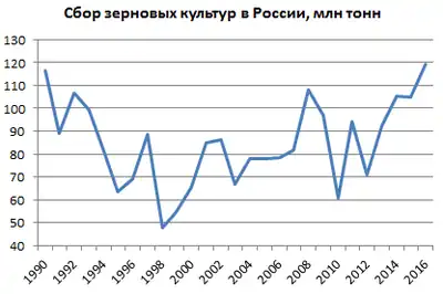 В 2008 году в России было собрано 108 млн тонн зерновых культур, это крупнейший урожай с 1990 года[14]. По итогам 2015 года было собрано 104,8 млн тонн зерновых[14].
