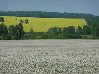 Поле цветущей гречихи (на переднем плане) в Новосибирской области