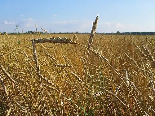 Род травянистых, в основном однолетних, растений семейства Злаки, или Мятликовые (Poaceae), ведущая зерновая культура во многих странах, в том числе и России. Получаемая из зёрен пшеницы мука идёт на выпекание хлеба, изготовление макаронных и кондитерских изделий. Пшеница также используется как кормовая культура, входит в некоторые рецепты приготовления пива и водки. Урожайность мягкой пшеницы в странах Европейского союза составляет 55 ц/га (5,5 т/га, или 550 т/км2), средняя урожайность в мире 22,5 ц/га. Максимальная урожайность до 98 ц/га (9,8 т/га, или 980 т/км2). Рекордная урожайность в среднем по России — 32,2 ц/га[15] (2017). Пшеница первенствует среди других сельскохозяйственных культур, на 2012 год мировая площадь посевов пшеницы составляла 215,5 млн.га., по данным ФАОСТАТ, (на втором месте кукуруза — 177,4 млн.га).