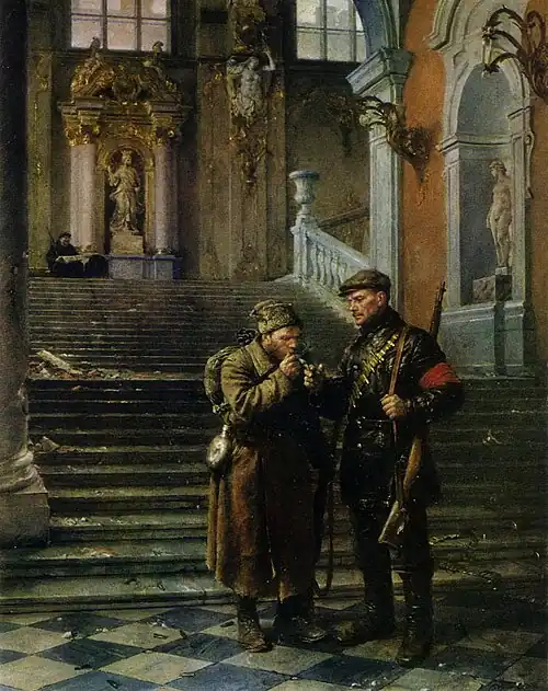 У подножия лестницы художник изобразил двух активных участников уже закончившегося сражения — вооружённых солдата и ополченца Красной гвардии, которые, по мнению советских искусствоведов, олицетворяли союз рабочего класса и трудящегося крестьянства[2]. На принадлежность рабочего Петрограда к Красной гвардии указывает изображённая художником красная повязка на рукаве. По мнению Лебедева, это — не случайная встреча, а патруль, выставленный здесь для «охраны бывшей цитадели царизма и Временного правительства»[7]. Солдат прикуривает у красногвардейца «цигарку»[3]. Доктор искусствоведения Софья Коровкевич считала, что это придаёт сцене подчёркнуто мирный характер[6]. Доктор искусствоведения Светлана Червонная, напротив, подчёркивала героизм и уверенность в своих силах персонажей картины и называла их героями нового мира[8].