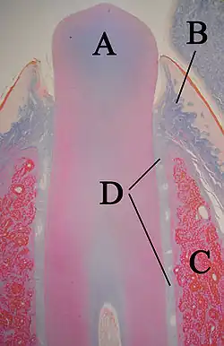 Зуб построен из трёх слоёв кальцификованных тканей: эмали, дентина и цемента. Полость зуба заполнена пульпой. Пульпа окружена дентином — основной кальцификованной тканью. На выступающей части зуба дентин покрыт эмалью. Погружённые в челюсть корни зубов покрыты цементом.