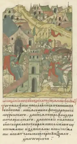 Взятие Казани (1487) и пленение казанского хана. Миниатюра летописного свода (XVI век)