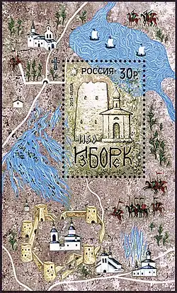 Почтовый блок, выпущенный Почтой России в ознаменование 1150-летия Изборска.  (ЦФА [АО «Марка»] 1606)