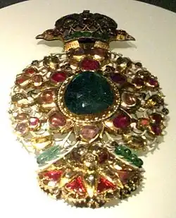- Изумруд «Могол» — вес 217,8 карат, размер 5,2×4×1,2 см[32], найден в 1695 году. На одной его стороне выгравированы тексты молитв, на другой — орнаменты цветов. Этот легендарный изумруд был куплен неизвестным лицом 28 сентября 2001 года на аукционе Кристис за 2,2 млн долларов.