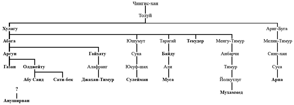 - Махмуд Арпа Койун-хан, сын Суса-огула, сына Салангана (Синг-хана), сына Мелик-Тимура, сына Ариг-Буги, сына Толуя, ильхан (1335—1336) под опекой визиря Гийас ад-Дина Рашиди