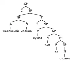 Рассмотрим как пример предложение Маленький мальчик кушал суп за столом. На диаграмме приведена его упрощённая синтаксическая структура.