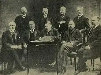 Сидят, слева: С. М. Сомов, А. И. Вышнеградский, А. К. Глазунов, Н. В. Арцыбушев, М. М. Курбанов. Стоят, слева: В. П. Лобойков, А. И. Чайковский, И. В. Шимкевич, М. Л. Нейшеллер[4].