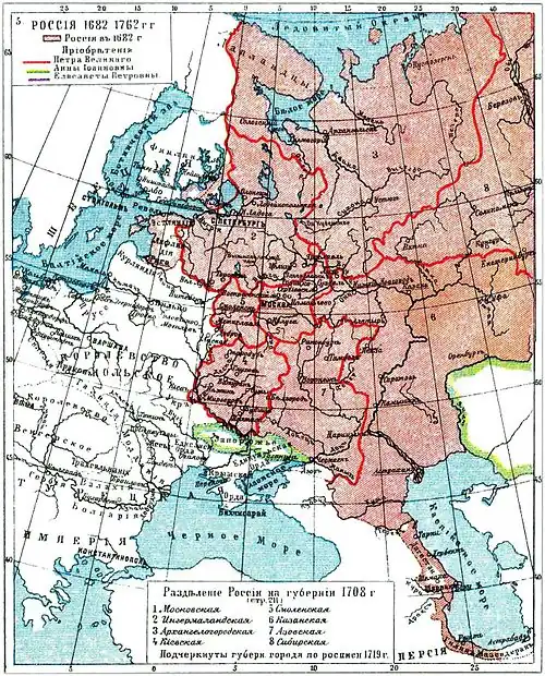 Часть губернии — Санкт-Петербургская провинция — территориально соответствовала Шведской Ингерманландии. Впоследствии из Санкт-Петербургской губернии выделились Эстляндская, Новгородская, Тверская, Псковская, Олонецкая и Ярославская губернии[15]. В 1712—1723 годах Ингерманландией управлял Ф. М. Апраксин; с 1728 по 1742 год генерал-губернатором Ингерманландии являлся Б. К. Миних — он был последним, кто получил назначение на эту должность[90][91].
