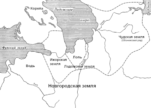Ижорская земля получила своё название от населявшего её племени ижора[39]. Начиная с XII века Водская и Ижорская земли существовали в составе Новгородской республики в качестве автономных административных единиц[40]. Колонизация новгородцами бассейна реки Невы и Приладожья происходила постепенно, и лишь к XIII веку эти земли полностью и окончательно вошли в состав Водской пятины Новгородской республики[22].