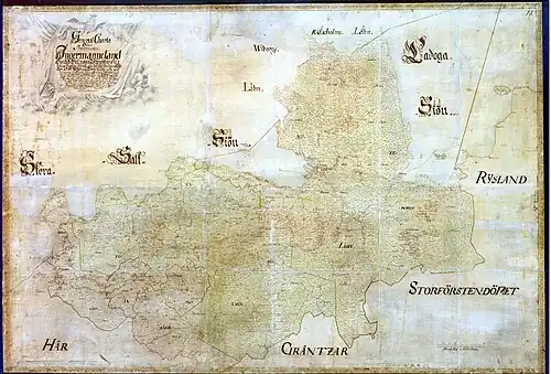 Швеция впервые заняла Ингерманландию в ходе Ливонской войны. Присоединение к Швеции имело несколько этапов. Северная и Центральная Ингерманландия были завоёваны в 1581 году шведским полководцем Понтусом Делагарди, после чего шведский король Юхан III добавил к своему имени титул «Великий князь Ингерманландии»[56]. Эти территории стали владением Швеции (швед. Svenska besittningar) после заключения Плюсского перемирия 1583 года. В отличие от провинций, Ингерманландия обладала статусом завоёванной территории и находилась под властью генерал-губернатора, который подчинялся напрямую королю. Русское царство сохранило за собой лишь Ореховский уезд и узкий выход к морю в устье Невы от реки Стрелки до реки Сестры[57]. Под власть Швеции отошли крепости Нарва, Ивангород, Ям и Копорье, однако территориальные уступки в тексте перемирия зафиксированы не были[58].