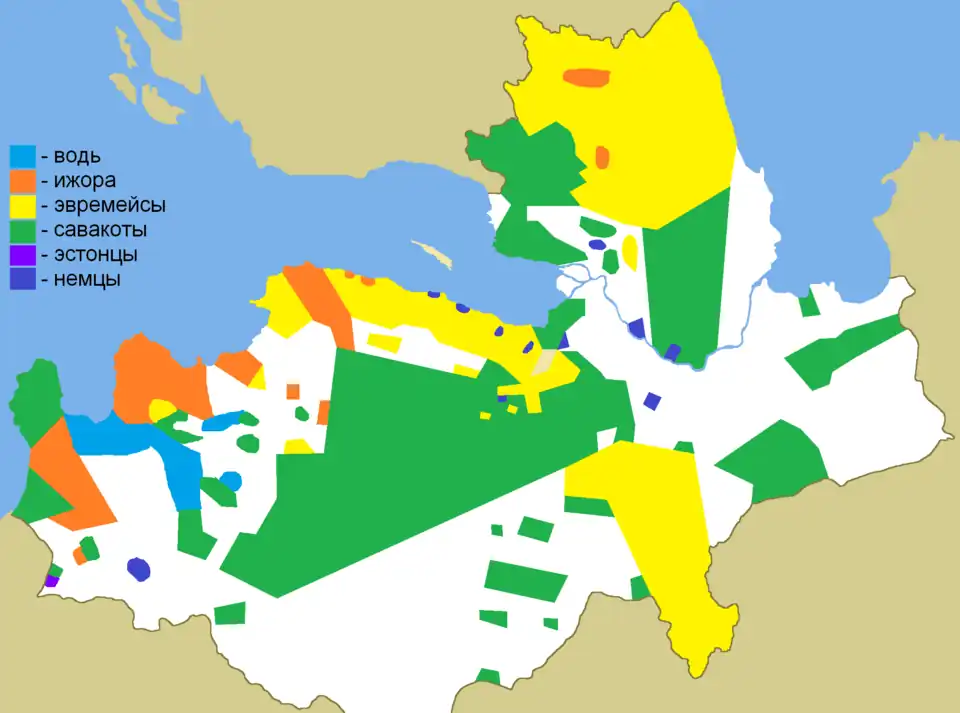 Ингерманландия уже в средние века являлась многонациональной территорией. В течение XVIII и XIX веков её этнический состав стал разнообразнее: к русским, ингерманландцам, води и ижоре прибавились немцы, эстонцы и латыши[96]. В 1849 году академик П. И. Кёппен издал «Этнографическую карту Санкт-Петербургской губернии» с пояснительным текстом, в котором впервые опубликовал количественные данные о проживающих в пределах исторической Ингерманландии народах: води, ижоре, савакотах и эвремейсах, а также данные о проживающих здесь немцах и эстонцах[97].