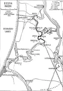 В 1920 году по условиям Тартуского мирного договора между РСФСР и Эстонией небольшая часть Западной Ингерманландии, так называемая Эстонская Ингерманландия (эст. Eesti Ingeri; фин. Viron Inkeri), расположенная вдоль правого берега реки Нарвы, была включена в состав Эстонской республики[119][19]. Новая граница прошла между реками Лугой и Нарвой[18]. Образованная на присоединённой к Эстонии территории волость Нарва (эст. Narva vald) включала в себя Ивангород (как район города Нарва), реку Россонь и 13 деревень, где проживали около 1800 человек[120][121][19].