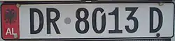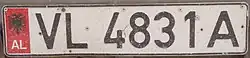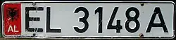 Регистрационный номерной знак Албании выполняется чёрными буквами на белом фоне. Повторяет вид итальянских номеров образца 1994 года.