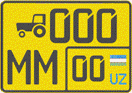Фон государственных регистрационных номеров жёлтый, окантовка, цифры и буквы чёрного цвета. В левом верхнем углу схематический рисунок трактора, в правом нижнем углу — код территории, флаг РУз и буквы «UZ». |