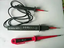 Такие индикаторы представляют собой более сложную конструкцию; вместо шунтового контакта из корпуса выходит отдельный проводник в усиленной изоляции со своим наконечником (щупом). Преимуществом является возможность указания численного значения напряжения помимо наличия фазы, т.к. вместо неоновой лампы имеют подсвечиваемую светодиодами шкалу. Кроме определения фазы, их конструкцией может быть предусмотрена возможность теста УЗО, о чём должно оповещаться в инструкции. Могут индицировать как переменное, так и постоянное напряжение с указанием полярности. Ряд моделей имеет функцию прозвонки цепи, для чего оснащаются источником питания, — обычно двумя батареями типа ААА. Функция определения напряжения действует и при полностью разряженной батарее. Рабочее напряжение большинства подобных тестеров 690В.