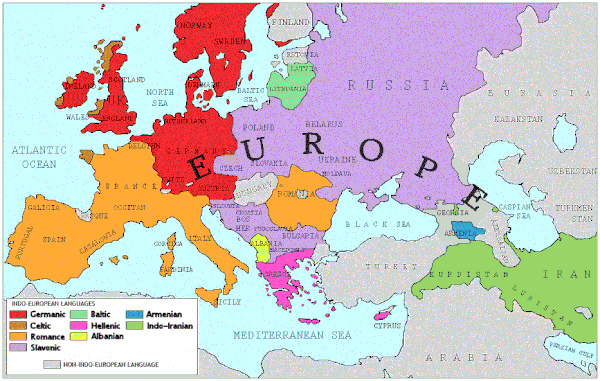 Языки индоевропейской семьи происходят от единого праиндоевропейского языка, носители которого жили, вероятно, 5—6 тысяч лет назад. Существует несколько гипотез о месте зарождения праиндоевропейского языка (в частности, называют такие регионы, как Восточная Европа, Передняя Азия, степные территории на стыке Европы и Азии). С большой вероятностью археологической культурой древних индоевропейцев (или одной из их ветвей) можно считать так называемую «ямную культуру», носители которой в III тысячелетии до н. э. обитали на востоке современной Украины и юге России[6]. Эту гипотезу подтверждают генетические исследования, которые указывают, что источником как минимум части из индоевропейских языков в Западной и Центральной Европе послужила массивная волна миграции носителей ямной культуры с территории причерноморских и поволжских степей приблизительно 4500 лет назад[7].