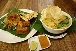 Также достаточно популярен, прежде всего в яванской кухне, арахисовый соус. Он имеет несколько вариаций, однако основой его неизменно служит измельчённый арахис, жаренный в арахисовом масле. При жарке в арахисовую массу добавляется соевый соус либо кокосовое молоко, сок лайма или лимона, часто кокосовый или пальмовый сахар, чеснок, острый перец и другие специи, иногда измельчённый репчатый лук. В готовом виде соус представляет собой достаточно густую жидкость, имеющую различные оттенки коричневого цвета. Арахисовый соус часто подаётся к сате и некоторым другим жареным блюдам, им обильно заправляется гадо-гадо[70][71][73].