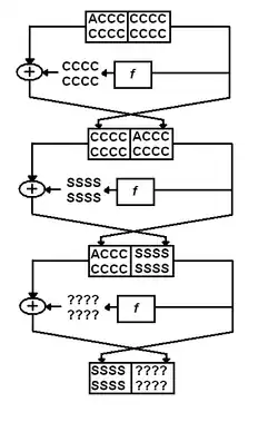 - Считая, что ячейки Фейстеля производят биективные отображения, очевидно, что одинаковые между шифротекстами блоки перейдут в одинаковые между преобразованными шифротекстами блоки (однако почти наверняка старое и новое значение будут различаться). Таким образом можем записать, что 1-я ячейка отобразила множество из класса множеств с одинаковыми по множеству компонентами в множество из такого же класса.