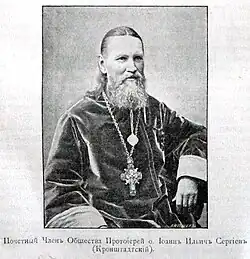 Иоа́нн Кроншта́дтский (настоящее имя — Иоа́нн Ильи́ч Се́ргиев; 19 (31) октября 1829, село Сура, Пинежский уезд, Архангельская губерния — 20 декабря 1908 (2 января 1909), Кронштадт, Санкт-Петербургская губерния) — священник Русской православной церкви, митрофорный протоиерей; настоятель Андреевского собора в Кронштадте; член Святейшего правительствующего синода с 1906 года (от участия в заседаниях уклонился); «вдохновитель создания и почётный член» Союза русского народа[2]. Проповедник, духовный писатель, церковно-общественный деятель правоконсервативных и монархических взглядов. Почётный член Императорского православного палестинского общества.