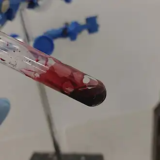 Пробирка с раствором элементарного иода в хлориде серы(I) — раствор малинового цвета