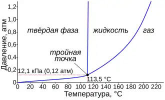 Фазовая диаграмма иода: тройная точка 386,65 К (113,5 °С), 12,1 кПа (0,12 атм); критическая точка 819 К (546 °С), 11,7 МПа (115 атм)
