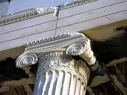 Фронтоны ионийских храмов тоже треугольные, но менее крутые, чем у дорийских, и, как правило, не заполняются скульптурой. Углы декорируются акротериями. Базы колонн имеют два варианта: малоазийский (конической формы) и аттический (с валиками и выкружкой). Ионический ордер превосходит дорический пластическими возможностями, он наряднее, изящнее, но эти качества достигаются ценой затруднений: ионическая капитель фронтальна — имеет один главный фасад. При помещении ее на угол здания красивые волюты будут видны только с одной стороны, а с другой — глухие балюстры (валики). Для таких случаев греки придумали специальную угловую капитель, но она оказалась асимметричной, треугольной. Это затруднение было преодолено только в абсолютно симметричной капители коринфского ордера (от названия города Коринфа между Аттикой и Пелопоннесом, где впервые обнаружили подобную капитель).