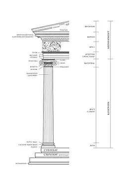Колонна ионического ордера, в отличие от дорического делится на три части: основание, ствол и капитель. База часто сама опиралась на квадратную в плане плиту — плинт. Выпуклые элементы базы — полувалы (или торусы), украшались орнаментальной порезкой или горизонтальными желобками, по смыслу аналогичными каннелюрам. Скоции — вогнутые элементы — обычно оставались гладкими. Ионическая колонна стройнее, чем дорическая: её высота в период архаики равнялась восьми диаметрам (1:8), а позднее превышала девять диаметров (1:9). Утончение ствола кверху также было меньше, чем, например, в дорическом ордере. Греческие зодчие расставляли колонны очень широко, стремясь таким образом к получению ощущения легкости и изящества.