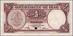 Иракский динар был равен по стоимости британскому фунту. Британские власти оказывали мощную поддержку иракской национальной валюте, обеспечивая стабильный обменный курс 1 динар = 1 фунт[2]. Это продолжалось до 1959 года, пока динары не перевели в доллары США по курсу 1 динар = 2,8 долл. США.[3].