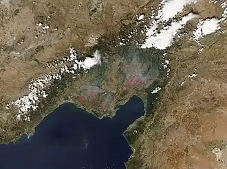 Далее на юг береговая линия обрывается крутыми склонами гор Нур, на которых и по сей день видны развалины армянских монастырей Сапиран, Шугр и Кармир-ванк. Горная цепь завершается на юге, недалеко от входа в залив — величественной горой Муса-Даг, хорошо известной миру из событий описанных в книге знаменитого писателя Франца Верфеля — «Сорок дней Муса-Дага», где жители шести ближайших армянских сёл, не повинуясь губительному приказу турецких властей, поднялась на эту гору, и около двух месяцев успешно защищали свои семьи от врага, превосходившего их во много раз по численности и вооружению.