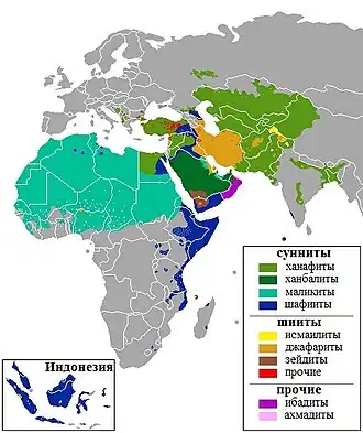В VIII—XI веках в суннизме возникли юридические школы (мазхабы): ханафитский, маликитский, шафиитский и ханбалитский мазхаб. Несмотря на то, что по некоторым вопросам среди мазхабов есть разночтения, все суннитские мазхабы считаются легитимными и равнозначными. Самым распространённым из мазхабов (которого придерживаются около трети всех мусульман мира) является ханафитский мазхаб, официально принятый в начале XVI века в Османской империи и ныне преобладающий среди мусульман бывшего СССР. Ханбализм представляет собой одновременно и богословскую школу, а его приверженцы, особенно салафиты (ваххабиты), отличается неприятием инакомыслия, буквализмом в понимании священных текстов, нетерпимостью ко всякого рода новшествам, крайней строгостью в соблюдении религиозных обрядов и норм[20].
