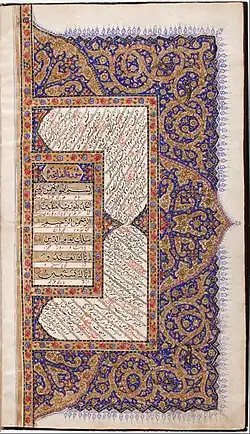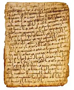 - Коран (араб. القرآن от арабск. кара’а — чтение вслух, назидание) — главная священная книга мусульман. Коран считается несотворённым и вечным словом Божьим, который в течение 22 лет по частям был передан пророку Мухаммеду через ангела Джибриля[11]. При жизни Мухаммеда содержание Корана передавалось по памяти. После его смерти, по приказу Праведного халифа Усмана был составлен и разослан в разные концы Халифата письменный текст (мусхаф) Корана, объявленный каноническим. Текст Корана делится на 114 глав (сура), имеющими различное количество стихов (аят) — от 3 до 286. По разным вариантам счёта в Коране от 6204 до 6236 аятов. Порядок расположения сур происходит не по содержанию и не по времени их появления. Особо почитается первая сура — аль-Фатиха, которая часто произносится верующими в качестве молитвы. Большая часть Корана написана рифмованной прозой[11]. Все суры Корана (кроме 9-й) начинаются со слов: «Во имя Аллаха, милостивого, милосердного…»[19]. Священным является текст Корана только на арабском языке, а его переводы, по мнению мусульман, не могут передать истинный смысл.
