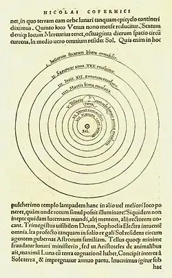 В 1543 году польский астроном Николай Коперник в своей работе «Об обращении небесных сфер» (лат. De Revolutionibus coelestium orbium) представил гелиоцентрическую модель Солнечной системы. В его подходе Земля вращалась вокруг Солнца по круговой орбите между круговыми орбитами Венеры и Марса. Его модель успешно объяснила причины, по которым Марс, Юпитер и Сатурн находились на противоположной стороне небесной сферы относительно Солнца в середине их попятного движения. Коперник смог расставить положение планет вокруг Солнца в правильном порядке, основываясь исключительно на периоде их орбиты вокруг Солнца[19]. Его теория постепенно получила признание у европейских астрономов, в частности этому сильно способствовало опубликование в 1551 году «Прусских таблиц» немецкого астронома Эразма Рейнгольда, которые были рассчитаны с использованием модели Коперника[20].