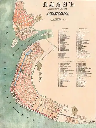 К 1897 году население города составило 20 тысяч человек; это составляло 2/3 всего губернского городского населения[10]. На следующий, 1898 год, Архангельск был связан с центральными губерниями узкоколейной железнодорожной веткой (через Вологду, где проходила пересадка на колею обычной ширины, действовавшей с 1870 года). Ветка, однако, заканчивалась на левом берегу Северной Двины станцией Архангельск-пристань; от конечной до города добирались на пароходах или паромах (летом) и санях (зимой). В периоды ледохода и ледостава временно прерывалось.