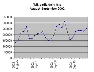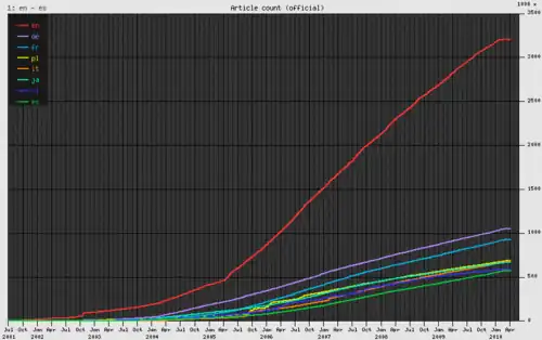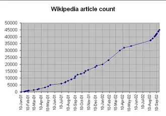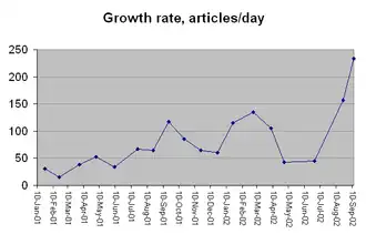 Количество статей проекта превысило 1000 12 февраля 2001 года, а 7 сентября перевалило за 10 000. В течение первого года существования Википедии было создано более 20 000 энциклопедических статей — в среднем более 1500 статей в месяц. 30 августа 2002 года количество статей достигло 40 000. Скорость роста более или менее устойчиво увеличивалась с самого запуска проекта, за исключением нескольких замедлений, вызванных программным обеспечением и аппаратурой.
