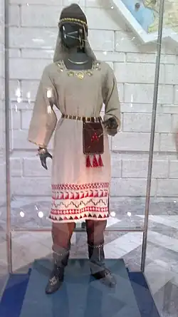 Знаменитыми памятниками сакской культуры стали могильник Бесшатыр (Пять шатров) в долине реки Или и курган Иссык под Алма-Атой, в котором были обнаружены останки знатного сака в кольчуге из золотых пластин (V—VI вв. до н. э.), названного исследователями «Золотым человеком». Сакское искусство характеризовалось сако-скифским «звериным стилем», что, вероятно, и отражало господствующий тип хозяйства — кочевое и полукочевое скотоводство, в тени которого развивалось земледелие (в долинах рек Сырдарьи, Чу и Таласа). В захоронениях Пазырыкского кургана (III—V вв. до н. э.) на Южном Алтае обнаружены фрагменты войлочного и ворсового ковра по орнаментальному убранству и технике исполнения близких к казахским народным изделиям — каз. түкті кілем — «ковёр» и каз. сырмақ — «стёганая кошма с узорчатой аппликацией в виде кривых рогов зверей»[20].