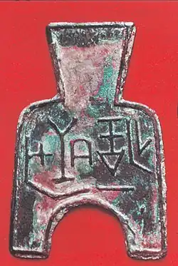 Китайская медная монета в виде мотыги. Лоян, V—III в. до н. э. (Изображение перевёрнуто вверх ногами.)