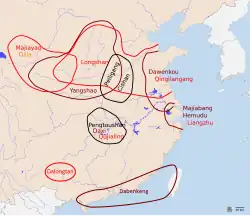 Китайская цивилизация (предков государствообразующего этноса хань) — группа культур (Баньпо 1, Шицзя, Баньпо 2, Мяодигоу, Чжуншаньчжай 2, Хоуган 1 и др.) среднего неолита (ок. 4500—2500 гг. до н. э.) в бассейне реки Хуанхэ, которые традиционно объединяются общим названием Яншао. Представители этих культур выращивали зерновые (чумиза и др.) и занимались разведением свиней. Позднее в этом районе распространилась культура Луншань: появились ближневосточные виды злаков (пшеница и ячмень) и породы домашнего скота (коровы, овцы, козы). Синхронно Яншао существовала культура Хуншань, сформировавшаяся на основе местной культуры Синлунва. У представителей культуры Хуншань определили Y-хромосомные гаплогруппы N1 (xN1a, N1c), С и O3a (O3a3)[29][30].
