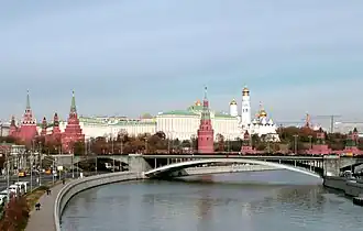 Москва развивалась быстрыми темпами, к городу присоединялись бывшие пригороды (Бабушкин, Люблино, Перово, Кунцево, Тушино и другие). Со строительством Московской кольцевой автомобильной дороги в 1960 году сформировались новые границы Москвы. Началась массовая застройка города типовыми многоэтажными жилыми домами — сперва на юго-западе столицы, выбранном в качестве экспериментального района, а затем и в других частях Москвы[69]. В конце 1960-х — начале 1970-х годов серьёзной перестройке подвергся центр города. Ради расширения существующих улиц, строительства новых магистралей и многоэтажных жилых домов были снесены архитектурные памятники[70]. К крупнейшим проектам относится прокладка в 1962—1968 годах сквозь старую городскую застройку проспекта Калинина (нынешнего Нового Арбата) с двадцатипятиэтажными зданиями, слабо увязанного с исторической средой[71]. В Останкине была построена телевизионная башня высотой 553 м[72].
