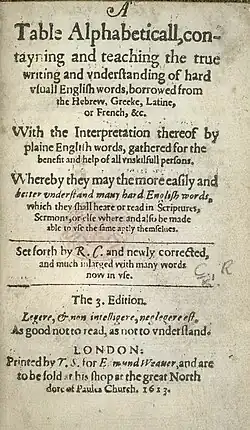 Полное название словаря: A table alphabeticall conteyning and teaching the true writing, and understanding of hard vsuall English wordes, borrowed from the Hebrew, Greeke, Latine, or French, &c. With the interpretation thereof by plaine English words, gathered for the benefit & helpe of ladies, gentlewomen, or any other unskilfull persons. Whereby they may the more easilie and better vnderstand many hard English wordes, vvhich they shall heare or read in scriptures, sermons, or elswhere, and also be made able to vse the same aptly themselues (Таблица Table Alphabeticall учит верно писать и понимать английские слова заимствованные из иврита, греческого, латыни или французского и т. д. с их интерпретацией на английский. Слова собраны в пользу и на помощь дам, знатных и простых людей. При этом они смогут легче и лучше понимать многие английские слова, которые они слышали в проповедях, читали в писаниях или каком другом месте.)
