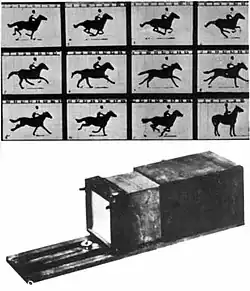 Третий шаг состоялся в 1877 году с изобретением хронофотографии. Он стал возможен благодаря работам Луи Дагера и Жозефа Ньепса, разработавших мокрый коллодионный процесс с достаточно высокой светочувствительностью, но требующий приготовления фотоматериала непосредственно перед съёмкой. Высокая светочувствительность позволяла уменьшить время экспозиции, без чего съёмка быстрого движения была бы невозможной. Пионеры фотографии, такие как Эдвард Мейбридж и Этьен-Жюль Маре, в 1870-80-х годах провели серию экспериментов по фотографированию последовательных фаз движения - человека, животных, маятника. Это позволило им визуализировать процесс движения и приблизиться к созданию первых образцов кинематографической техники. В 1878 году губернатор Калифорнии Леланд Стэнфорд и фотограф Эдвард Мейбридж провели эксперимент по фотофиксированию галопа лошади. По одним данным, Стэнфорд поспорил c Мейбриджем на тему того, «отрывает во время галопа лошадь все четыре ноги от земли или нет», по другим — Мэйбридж просто выполнял заказ Стэнфорда, занимавшегося анализом движения лошади. Они установили вдоль беговой дорожки для лошадей 12 фотоаппаратов, размещённых в специальных светонепроницаемых будках. Ассистенты в будках по сигнальному свистку одновременно начинали готовить фотопластинки для съёмки[2]. По мере готовности всех камер на дорожку выпускалась лошадь, которая скакала вдоль белой стены напротив фотоаппаратов. Затворы всех фотоаппаратов приводились в действие верёвками, натянутыми поперек трека: лошадь разрывала их, поочерёдно запуская фотоаппараты[3]. В итоге, каждый из фотоаппаратов снимал отдельную фазу движения лошади на белом фоне стены, подчёркивающей силуэт. Это была первая попытка разложить движение на фазы. В дальнейшем Мэйбридж увеличил число фотоаппаратов до 24, а полученные снимки использовал в изобретённом им зупраксископе, дававшем движущееся изображение.