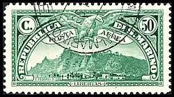 Первые авиапочтовые выпуски поступили в обращение 11 июля 1931 года. Серия состояла из 10 номиналов, причём марка в 10 лир имела тираж всего 9,5 тысячи экземпляров. Эта марка остаётся самой дорогой авиапочтовой маркой республики.[15] На миниатюрах была изображена высочайшая точка Сан-Марино гора Монте-Титано[10][16].