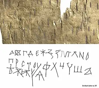 Массовым стало проникновение письменности на Русь после Крещения Руси князем Владимиром в 988 году. Начинается централизованное «учение книжное» детей социальной элиты («нарочитой чади»). К памятникам самого раннего периода относятся: церковные книги (Новгородский кодекс рубежа X—XI веков, Остромирово евангелие середины XI века), надписи на древнерусских деревянных «цилиндрах-замках» (пломбах)[16] и мечах (конец X века), легенды монет Владимира, Святополка и Ярослава, тексты на княжеских печатях, надписи на стенах церквей, берестяные грамоты (примерно с 1030 года).