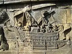 Важное для историков изображение судна имеется на росписи буддийского пещерного храма Аджанта. Корабль в общих чертах соответствует судам, описанным в джатаках. На каждой из трёх мачт имеются прямые паруса, однако высота у них значительно больше ширины, а над бушпритом поднят один косой парус. Нос корабля украшен изображением глаза, который, согласно легендам, оберегал моряков от опасностей. Кормчий управляет боковым рулём, на корме имеется навес, под которым хранятся глиняные сосуды. Трюм относительно глубокий, но борт имеет меньший изгиб, чем у кораблей со сатаваханских монет[45].
