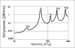 График зависимости затухания в атмосфере от частоты в диапазоне КВЧ