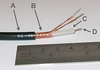 А: внешняя пластиковая оболочка; B: медная оплётка; C: внутренний пластиковый изолятор; D: центральный проводник