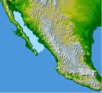 Калифорни́йский зали́в (исп. Golfo de California), известен также как мо́ре Корте́са (исп. Mar de Cortés) и Алое море (исп. Mar Bermejo) — залив, отделяющий полуостров Калифорния от мексиканского континентального побережья Тихого океана. Воды залива омывают побережья мексиканских штатов Нижняя Калифорния, Южная Нижняя Калифорния, Сонора и Синалоа, длина береговой линии составляет порядка 4000 км. Реки, впадающие в Калифорнийский залив, включают Колорадо, Фуэрте, Майо, Синалоа, Сонора и Яки. Поверхность залива составляет около 177 000 км2. Максимальная глубина превышает 3000 метров из-за сложной геологии, связанной с тектоникой плит[2].