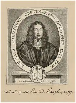 - ↑ Feller, François-Xavier de. Dictionnaire historique, Volume 2. — Mathieu Rieger fils, 1782. — С. 18.. — «CALLIACHI, ( Nicolas ) grec de Candie , y naquit en 1645. Il profefla les belles».