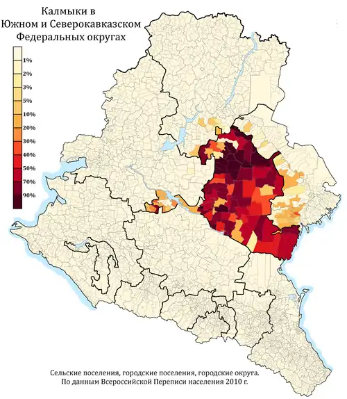 В последние десятилетия существования Российской империи (нач. XX века) калмыцкий народ проживал разрозненно в различных административно-территориальных единицах России, в основном в 8 улусах (Малодербетовском, Манычском, Икицохуровском, Багацохуровском, Харахусовском, Эркетеневском, Яндыко-Мочажном, Хошеутовском) в так называемой «Калмыцкой степи» Астраханской губернии (к началу Первой мировой войны — более 147000 калмыков). Значительная часть калмыков жили в Области войска Донского (13 станиц Сальского округа — 31516 человек в 1914 году) и Ставропольской губернии (Большедербетовский улус — 8517 человек в 1914 году). По территории Терской области кочевали терские и кумские калмыки общей численностью 4000 человек. Также известно о небольших группах калмыков, которые несли службу в составе казачьих войск: Оренбургского (более 1000 человек), Астраханского (более 900 человек) и Уральского (около 700 человек)[38].